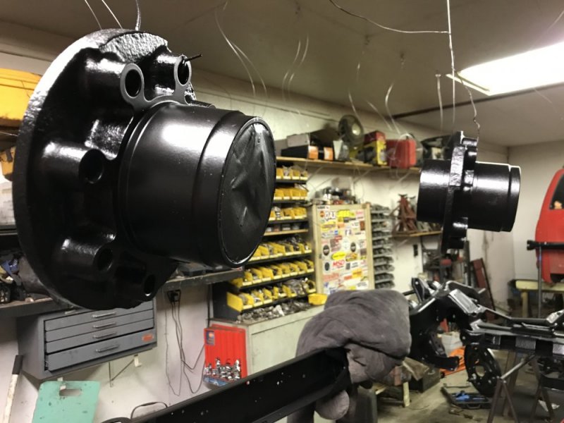 And here it is tonight with front brakes on and the tie rods loosely installed with the QA1 tie rod sleeves from that place @Husker6.5 loves 😁. I think it looks kinda spiffy now.