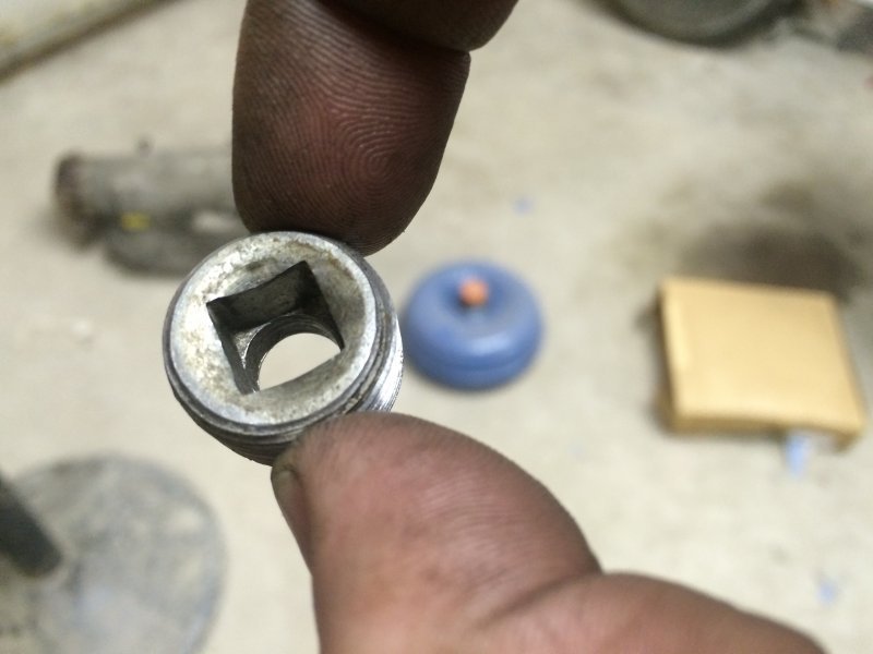 Well I managed to not just throw my hands in there and actually get some stuff done tonight. First I took the opportunity to make the coolant bypass restrictor I hadn't made yet. I tapped the fitting on the water pump with a 1/2" NPT tap. Then drilled a 3/8" hole in a 1/2" pipe plug.