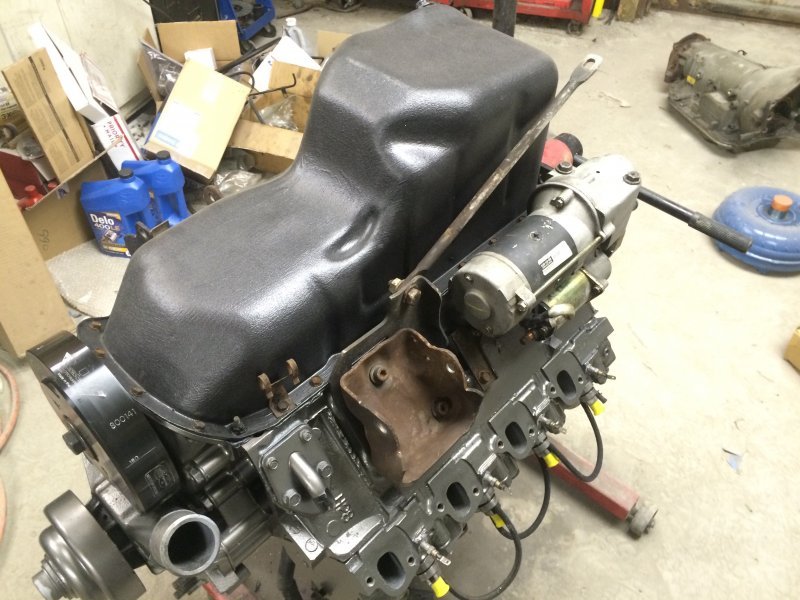 I had planned on not putting any sheet metal on the engine until I had the rockers on but decided I was tired of waiting and might as well spend the time putting the bottom of the engine on. So I put the oil pan, starter and motor mounts on. FYI, the motor mount bolts are SAE on a 97 but Metric on an Optimizer. Luckily the exhaust manifild bolts that came on the Optimizer that I wasn't using were a suitable substitution. I could have put manifolds and oil cooler lines on but ran out of "want to" for tonight.