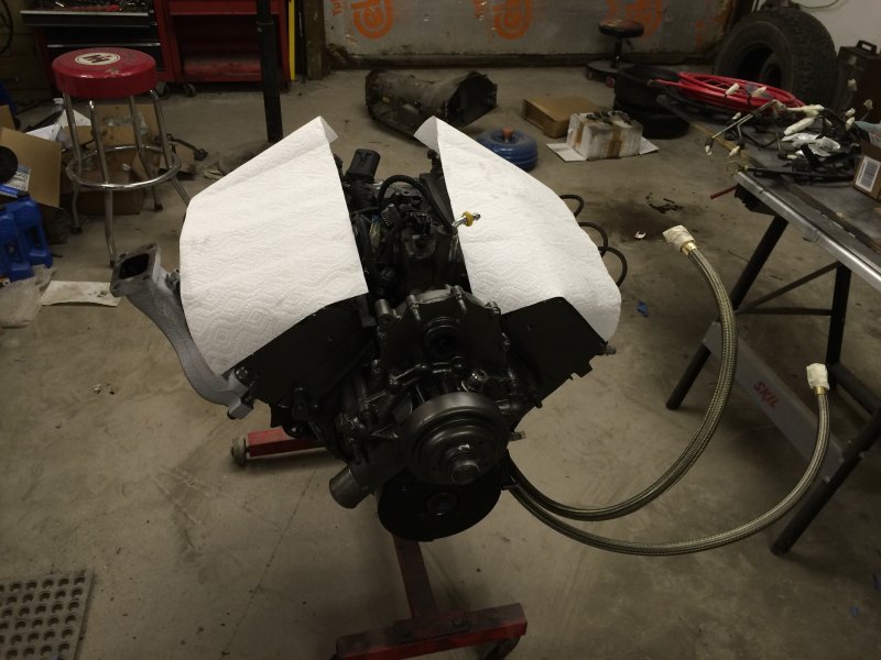 Ok I'm all prepped for the arrival of the arms tomorrow. I put the oil cooler hoses and exhaust manifolds on. I have the workspace cleaned up and tools & supplies all laid out. Tomorrow after work my brother and some pizza are coming over and we're going to finish buttoning it up then lay it in the framerails. I could drop it in by myself but it will be nice having an extra set of hands to guide it in so the new paint doesn't get all scratched. I'm still hopeful I'll get it fired Sunday but I won't rush it. I still have to figure out where I'm going to remote mount the FFM and then make the bracket to do so. I want to hang it off the AC bracket but we'll see how things look once everything else is in place.