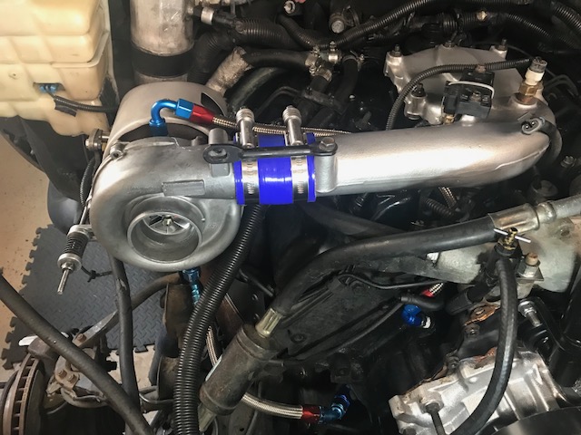 Turbo is on. Old drain line is too long so I tried to shorten it but, these 10AN fittings can only take so many re-uses and this one gave up the ghost. Waiting on parts now.