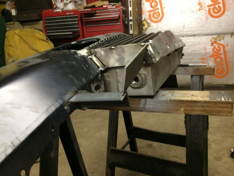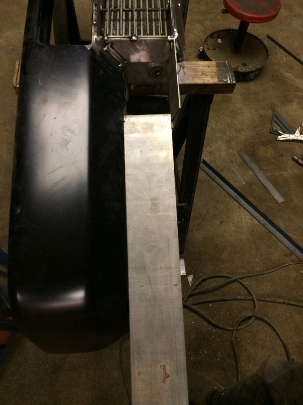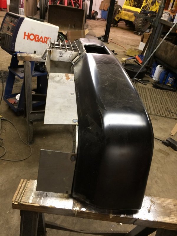 Then I swapped bumpers again and started work on the deflector. Lots of pie cuts tonight but it worked well to make a piece that follows the contour. After that I cut the straight pieces (the easy pieces) and tacked those into place. I'll bolt it back on before trying to make the next piece so I make sure I'm not pushing the end of the bumper up or pulling it down with the deflector. I think it's going to be pretty cool, but far from finished....