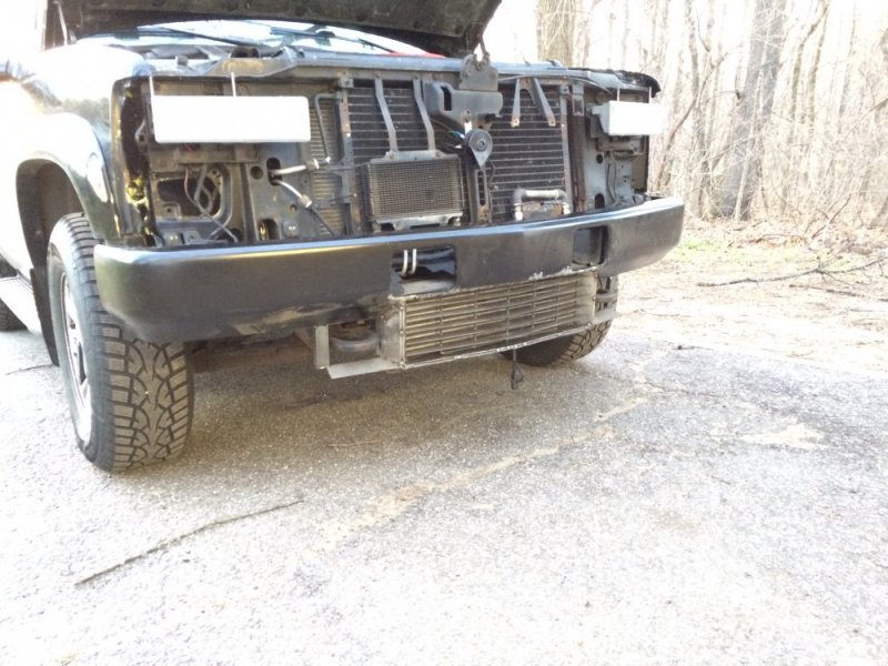 Here's an idea, Nate. Take a gasser front bumper, turn it upside down, notch it and box it to fit around the bottom of the radiator and bolt it to the diesel bumper using the holes for the factory plastic spoiler. It would be solid, the lines would reflect each other and you would have a unique, badass massive looking front bumper that would be aerodynamic.