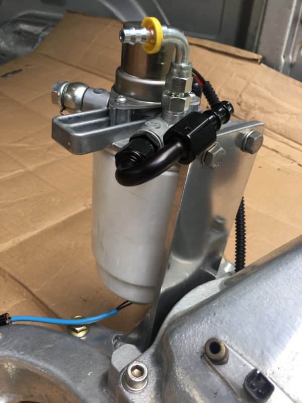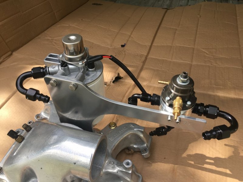 So the previous photo's are for what I will call the "ADVANCED BOOST REFERENCED, DEDICATED RETURN, ADJUSTABLE FPR SYSTEM". Which I will not be using initially due to the fact that it requires a lift pump capable of 30 psi and the the addition of a dedicated return line which requires dropping the fuel tank. So here are some photo's of my "BASIC FUEL SYSTEM" which I will use with my existing Walbro FRB 10 lift pump which put out 14 PSI measured just before the original fuel filter housing previously. The new fuel filter assembly measures the fuel pressure of the fuel exiting the fuel filter.